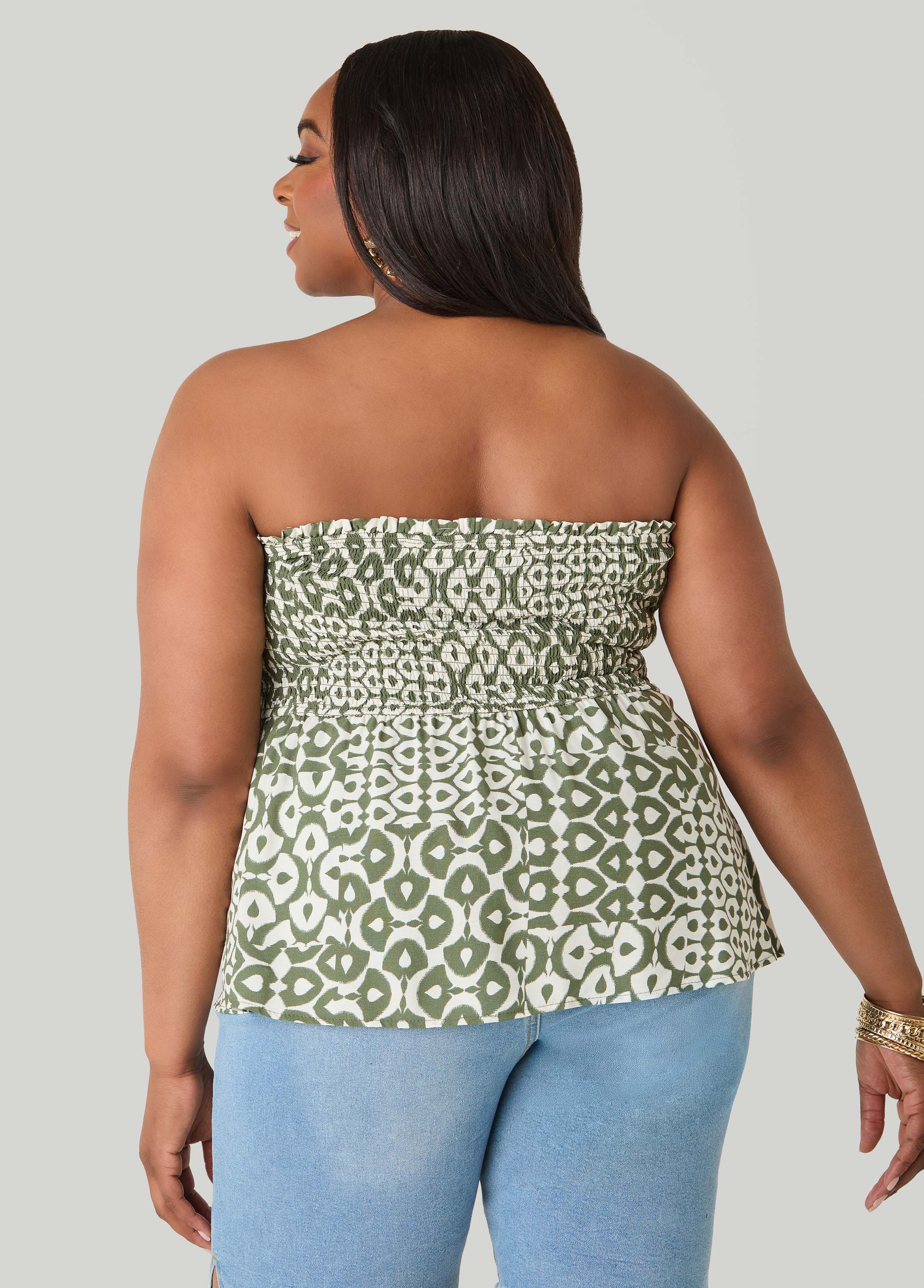 A statement in every detail. This strapless printed top features a shirred bodice for a close, flexible fit finished with a handkerchief hem that creates a fluid, eye-catching drape.