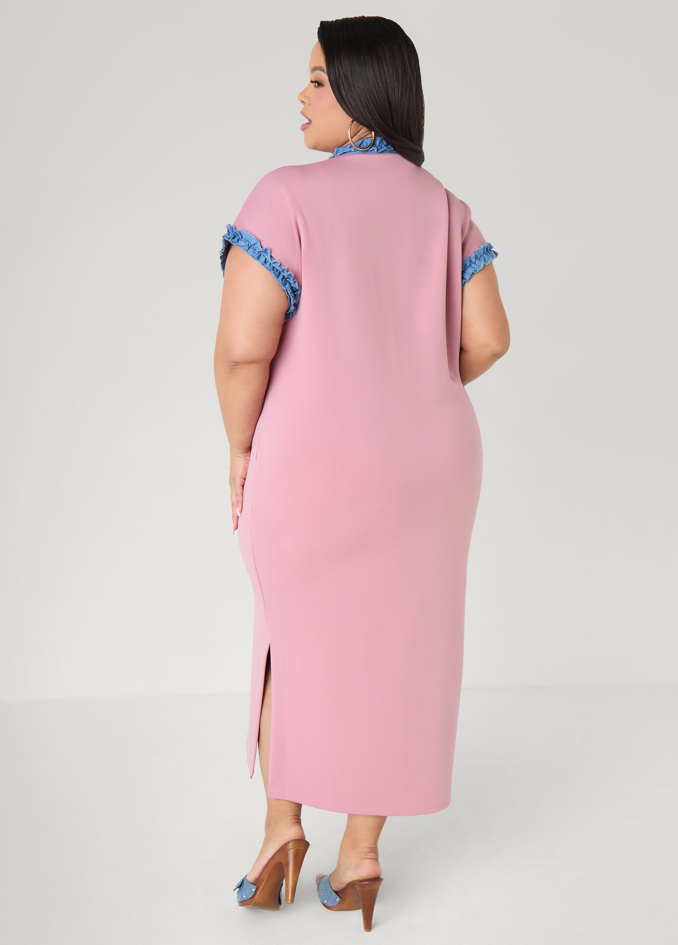 A smooth scuba fabric gives this maxi bodycon dress a sculpted fit. The V-neck. The side split. The ruffled denim? They all add texture, shape and sexiness to this pared back, full-length design.