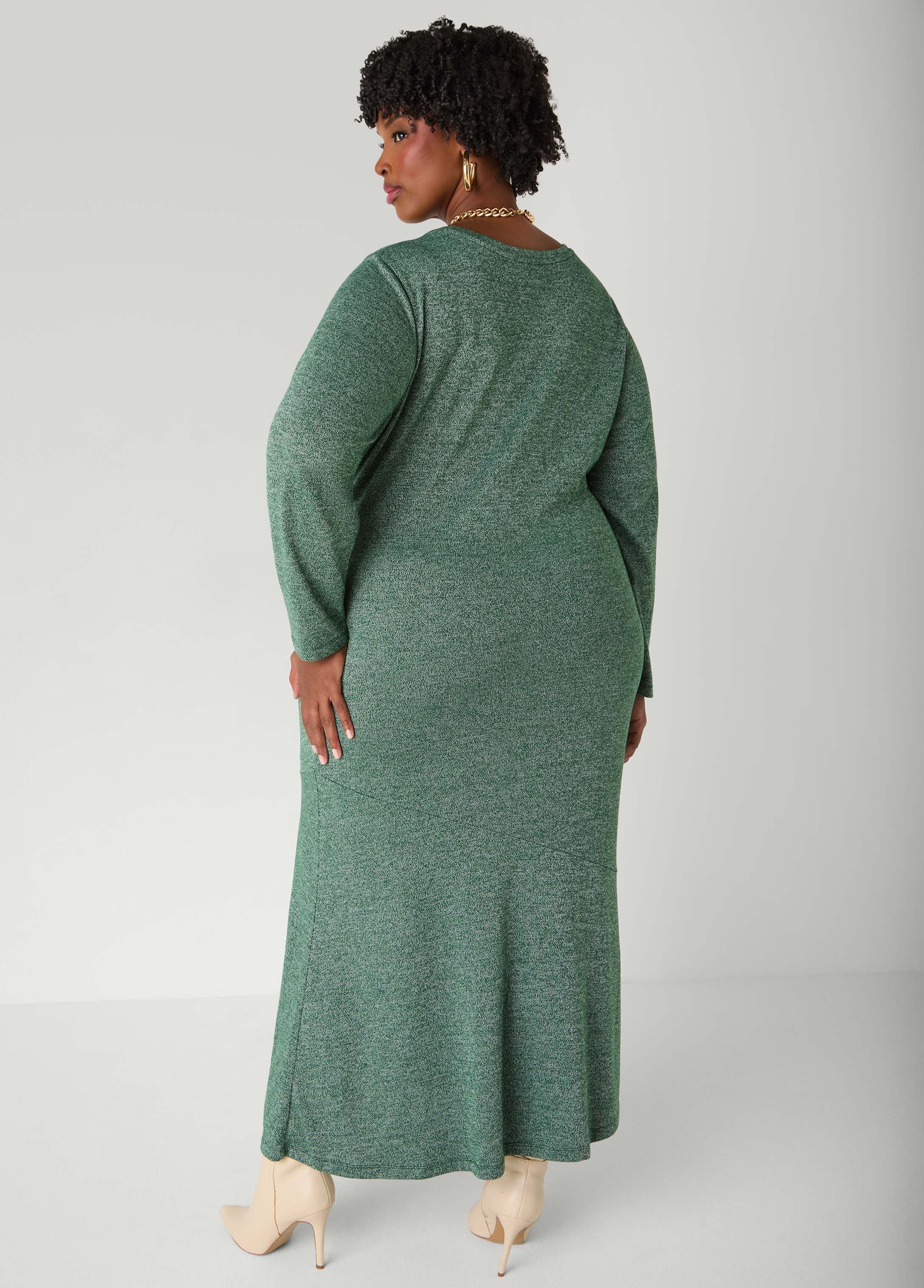 Made for lounging or late nights out, this marled maxi tee dress brings soft stretch and subtle drama with its gathered side, front split and asymmetric hem.