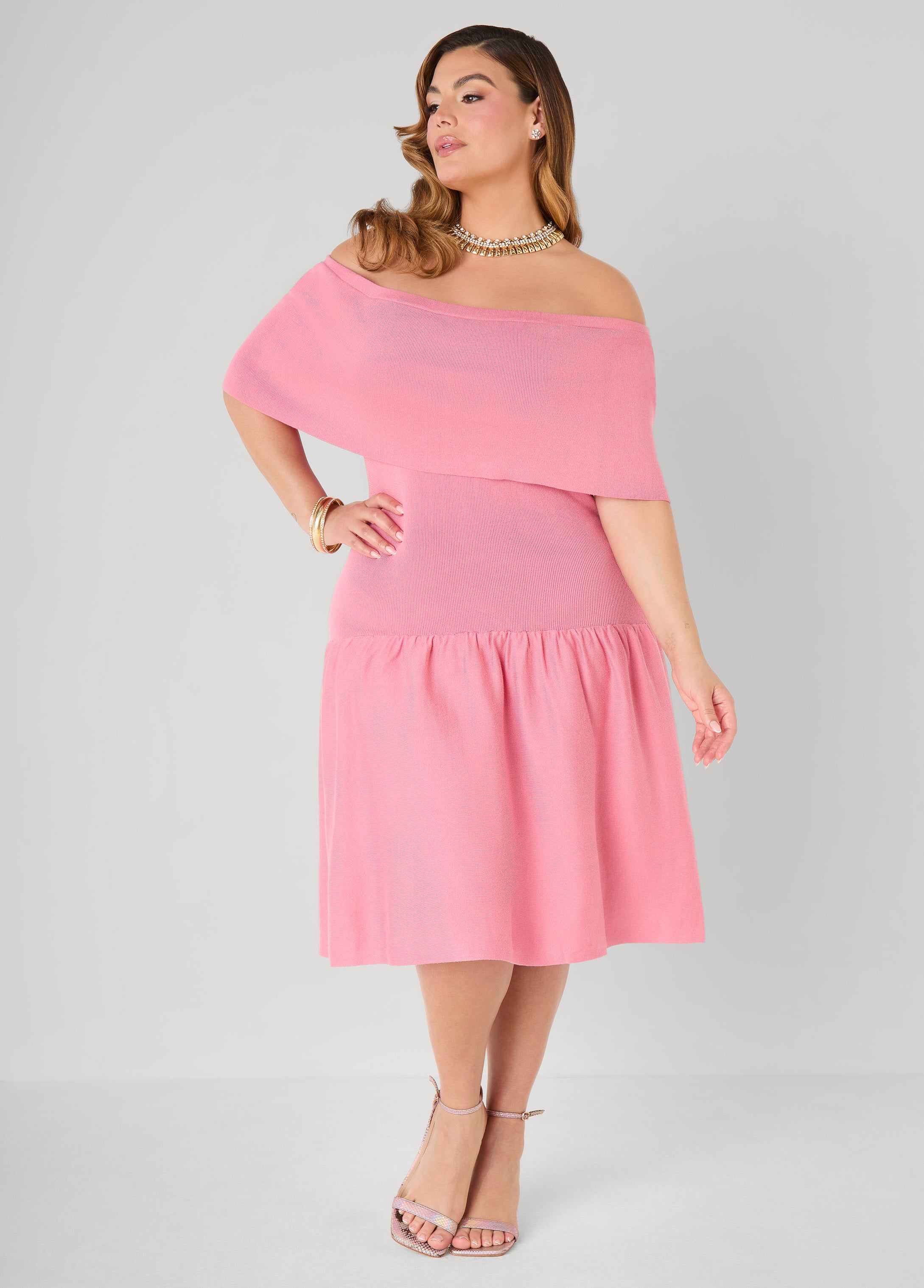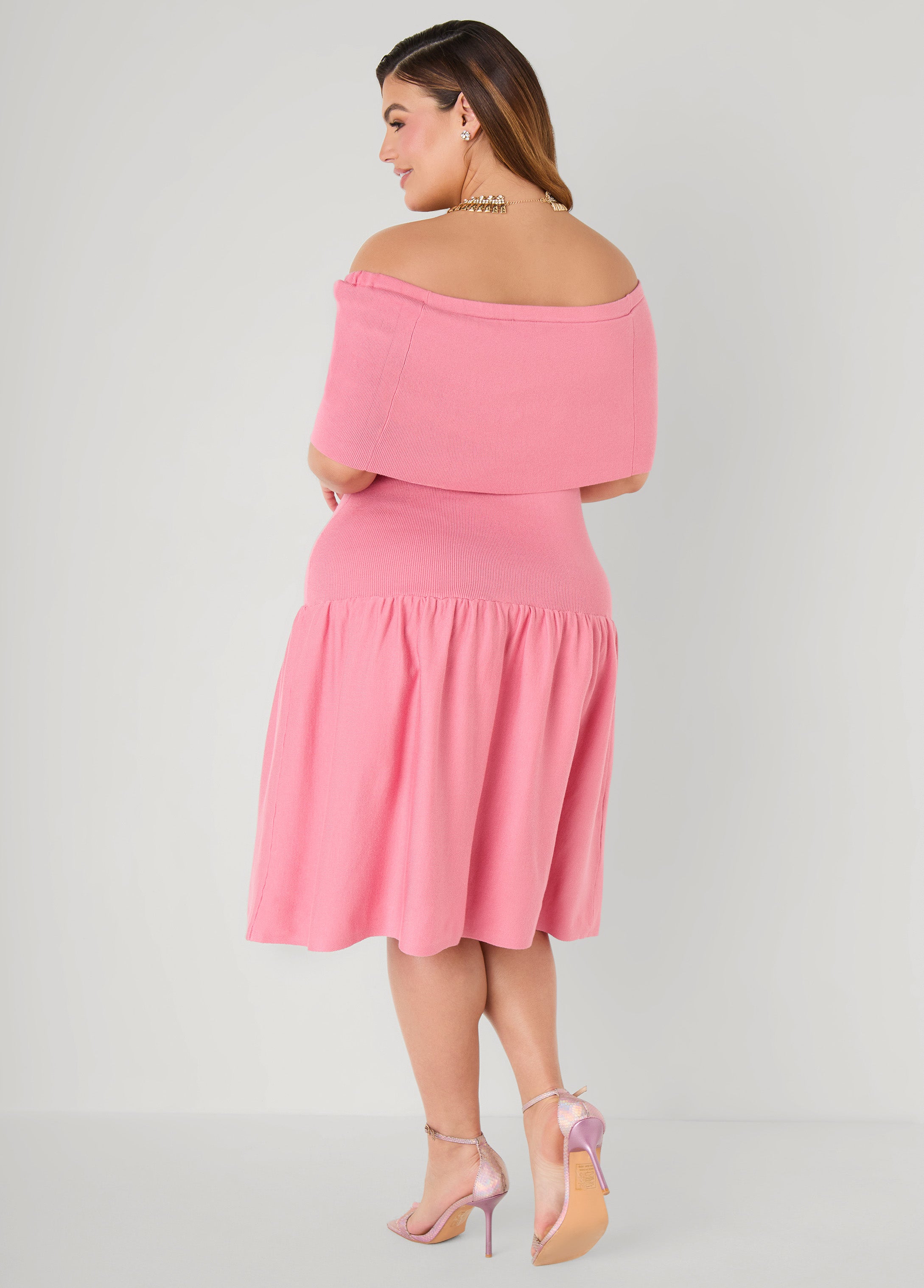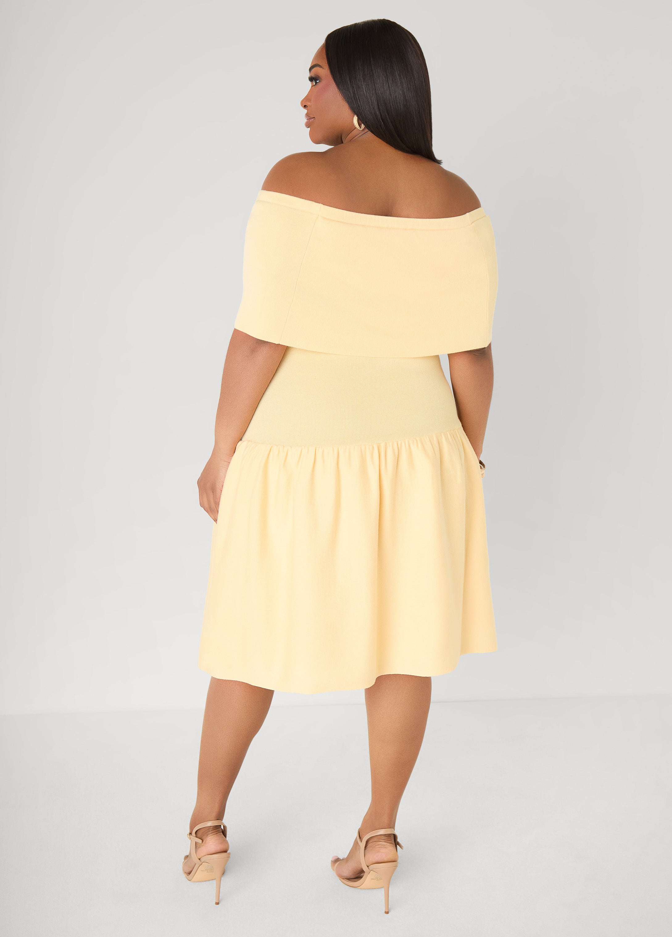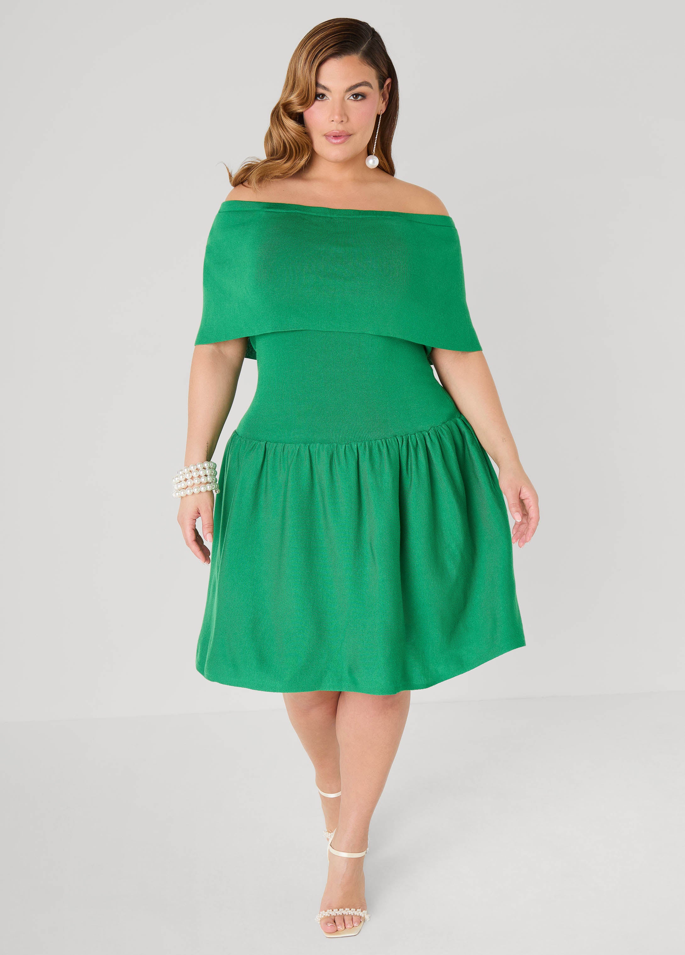 Designed with summer sweetness in mind, this off-the-shoulder knit dress features a foldover neckline, drop waist and sweeping A-line skirt.”