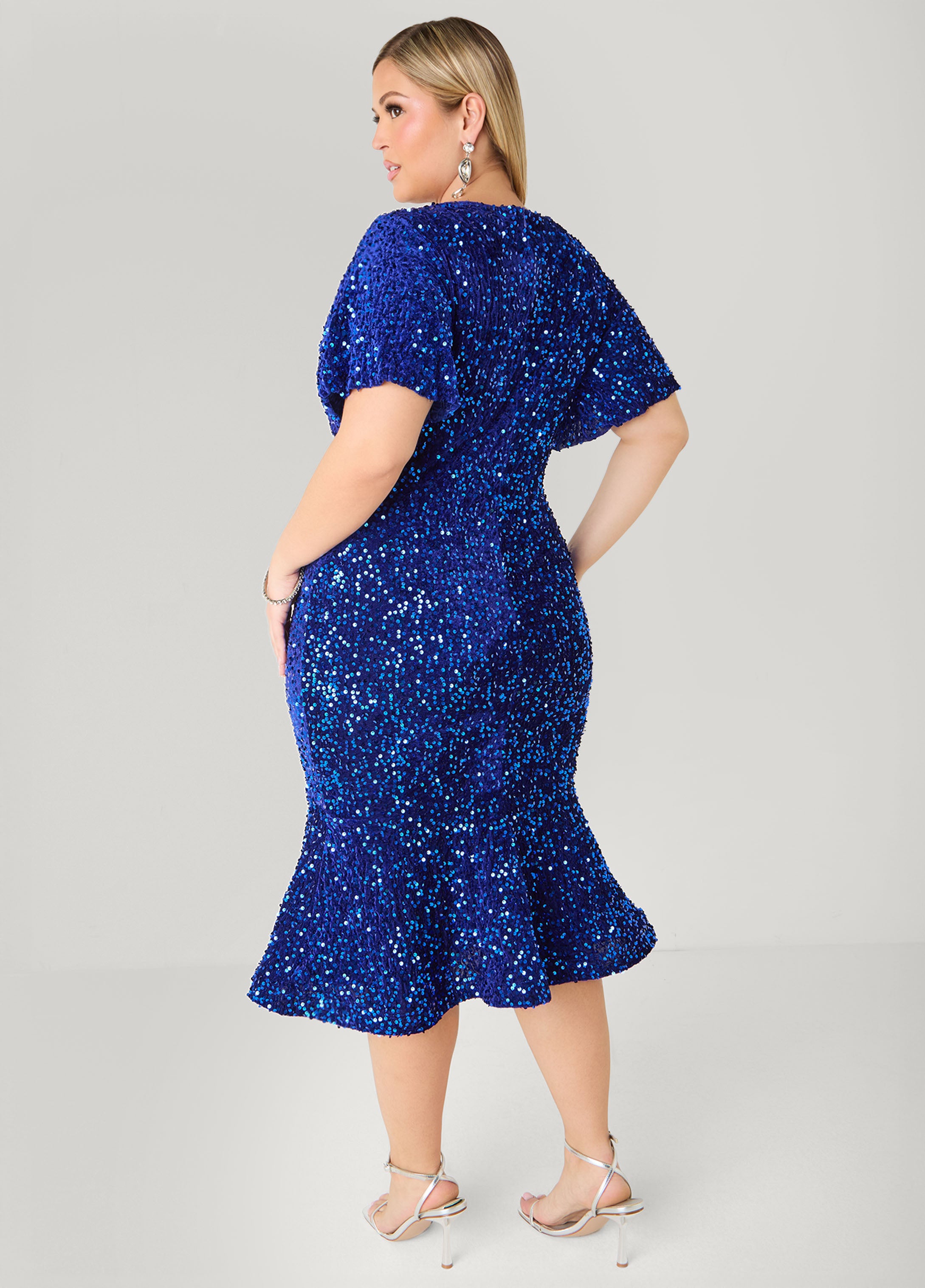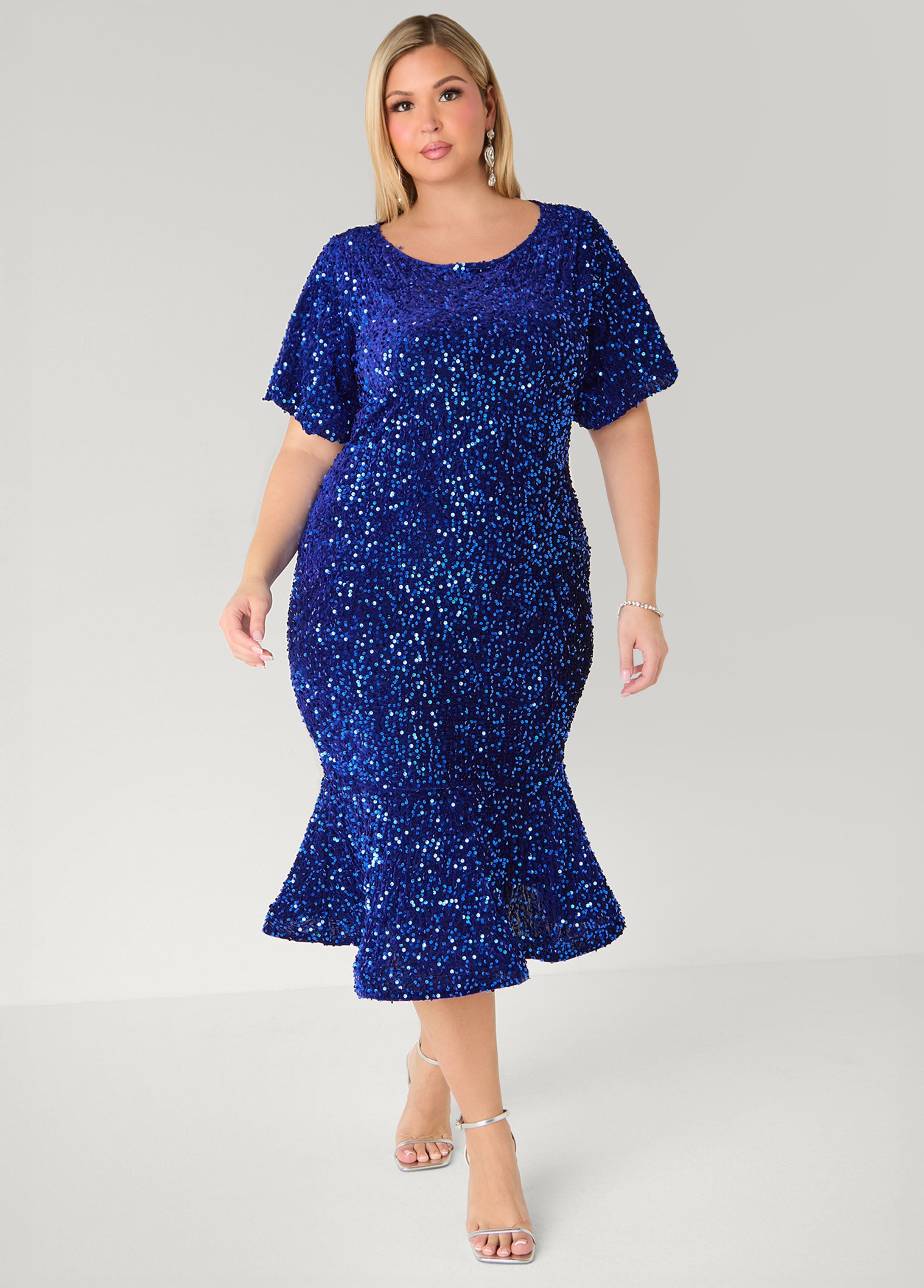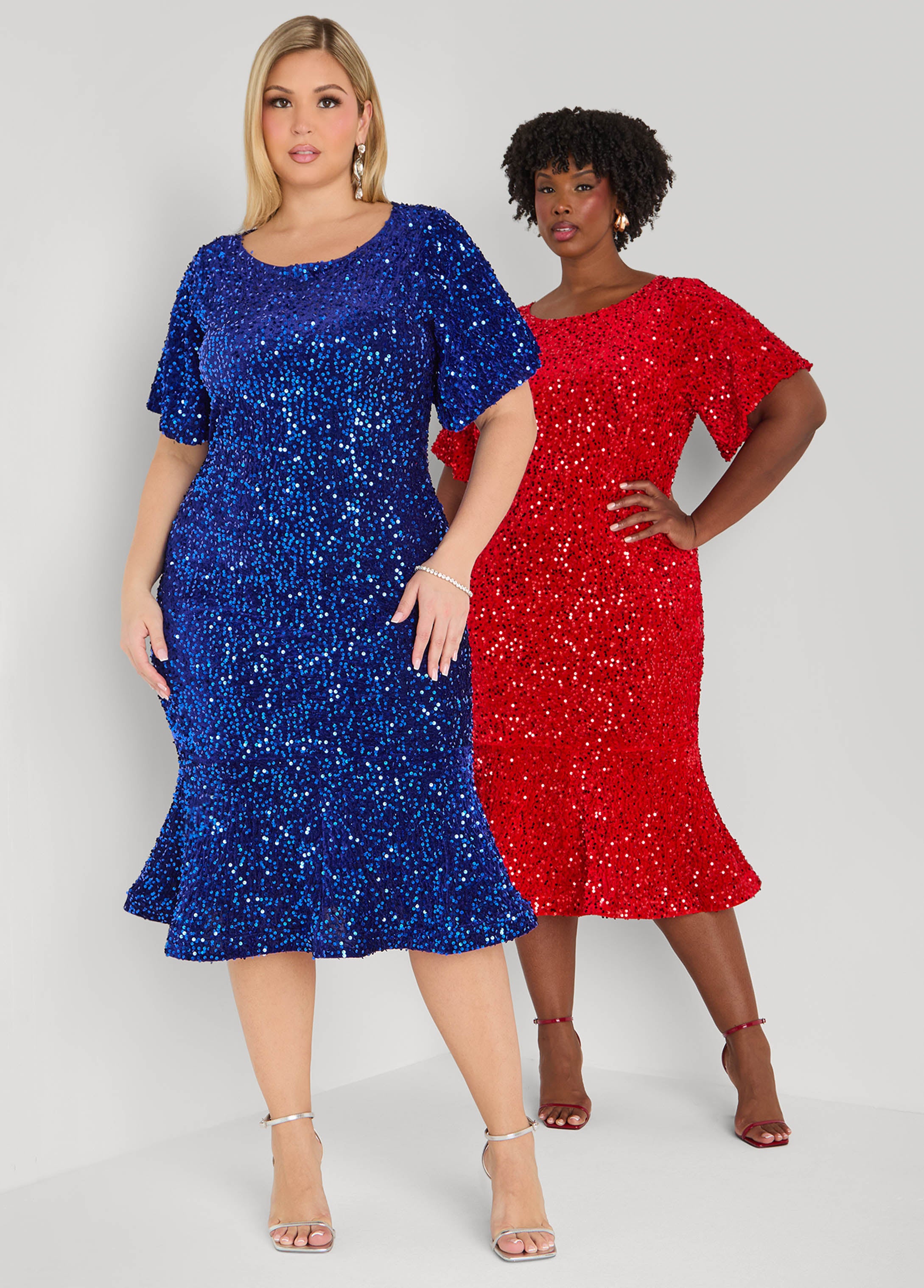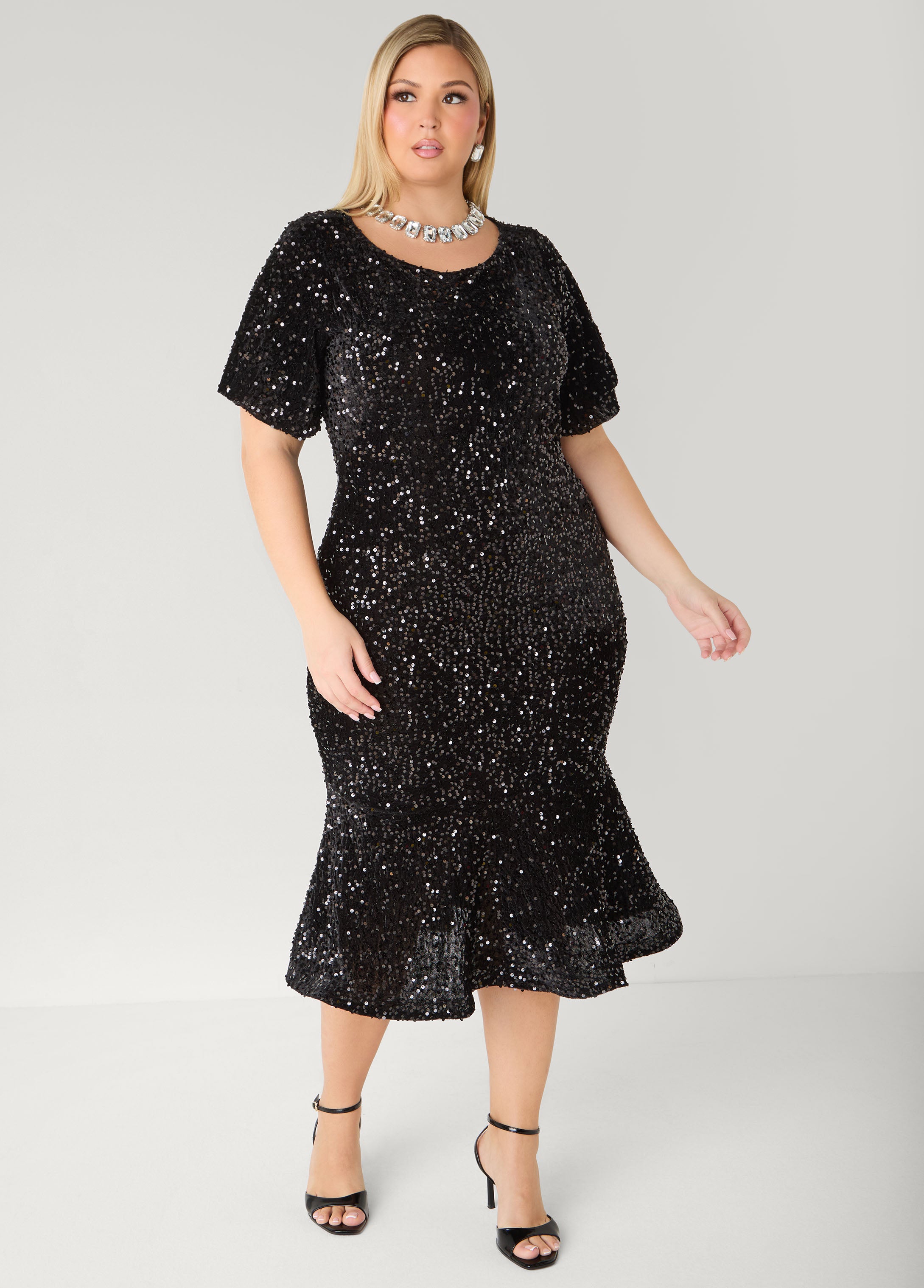 Shine bright this season in this stretch-velvet dress. Tonal sequins sparkle subtly while the flounce adds a playful holiday bounce to your step.