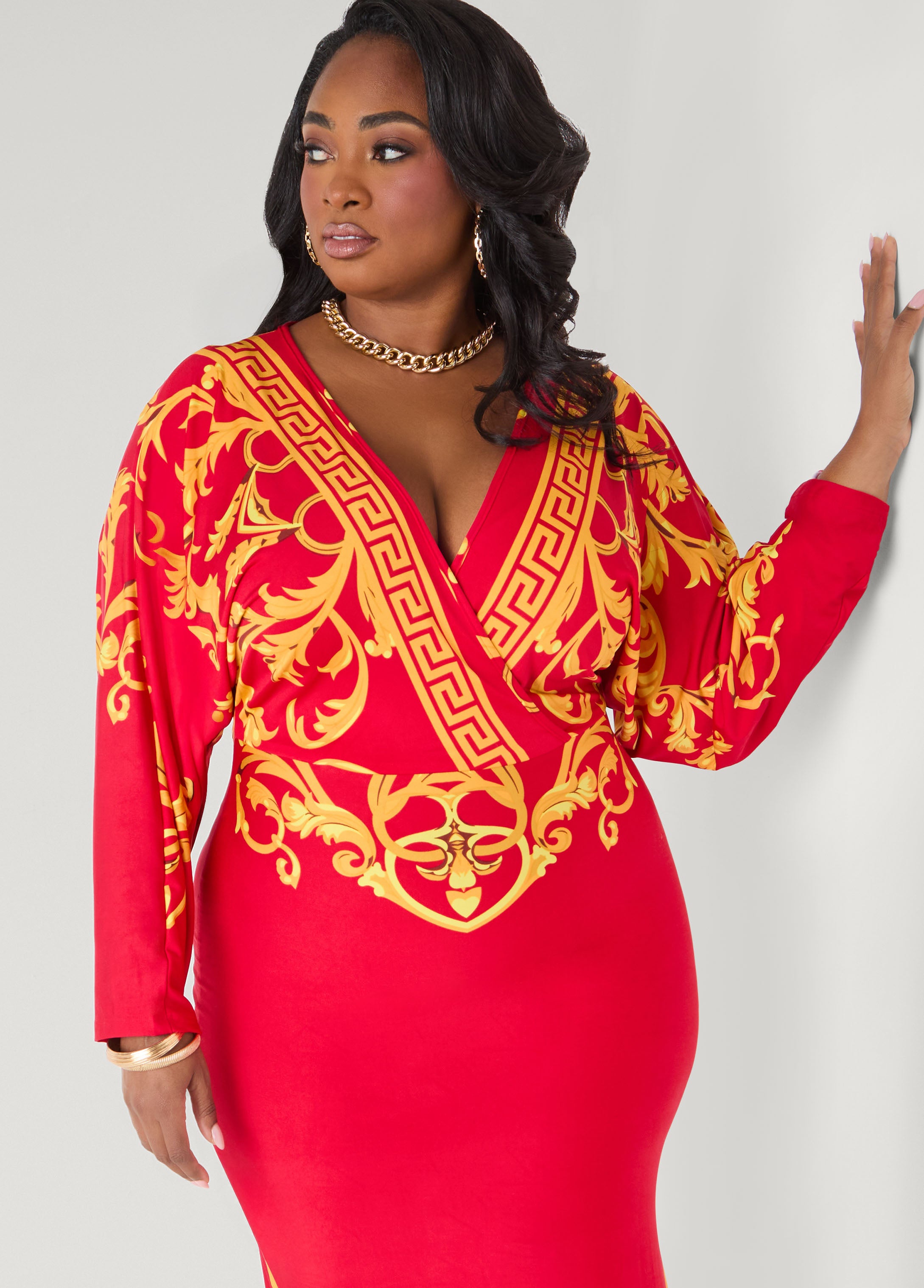 Turn up the volume in this status & Greek key print stretch-knit maxi dress. The faux wrap neck and dolman sleeves skim your curves while the side slit taunts & teases. Slip-on style in regular and tall lengths keeps it sleek, sexy, and effortless.