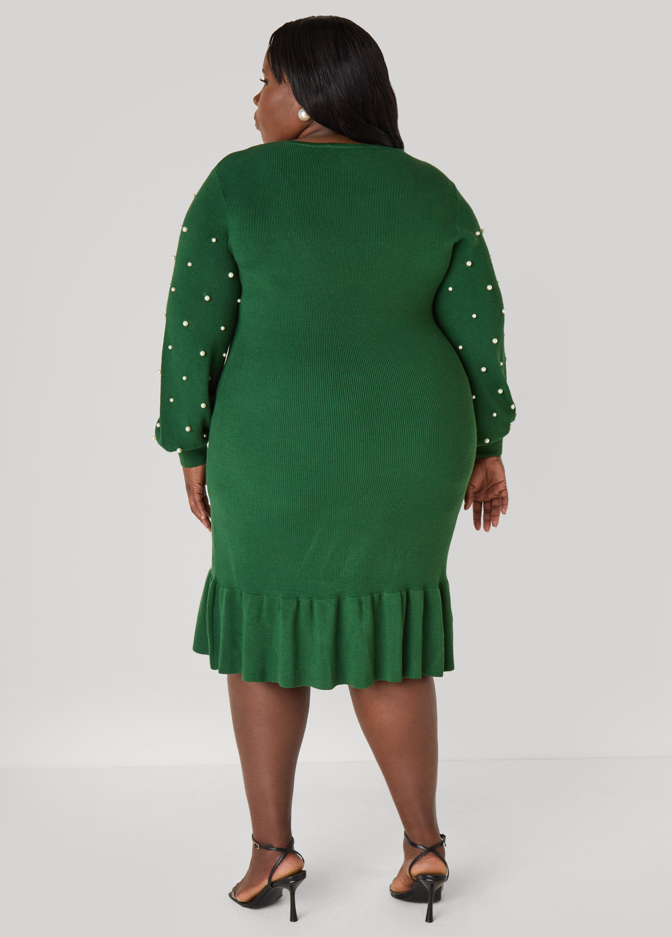 • Knitted dress with faux pearl embellishments and flounced hemline. Slip-on style. Length: 44in.