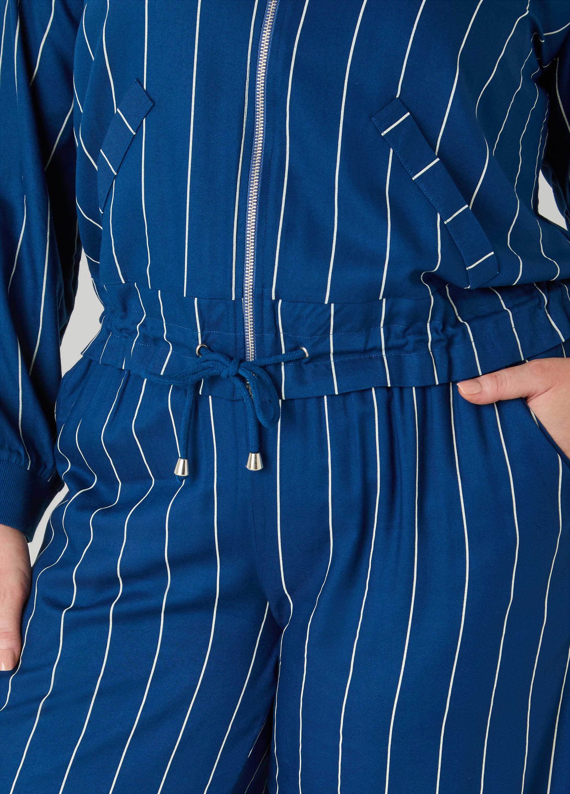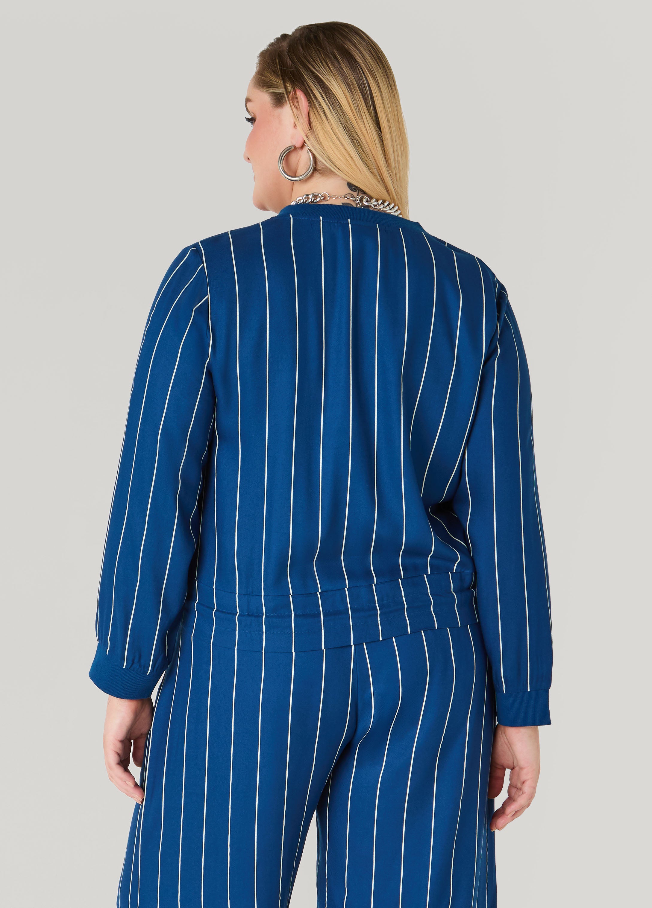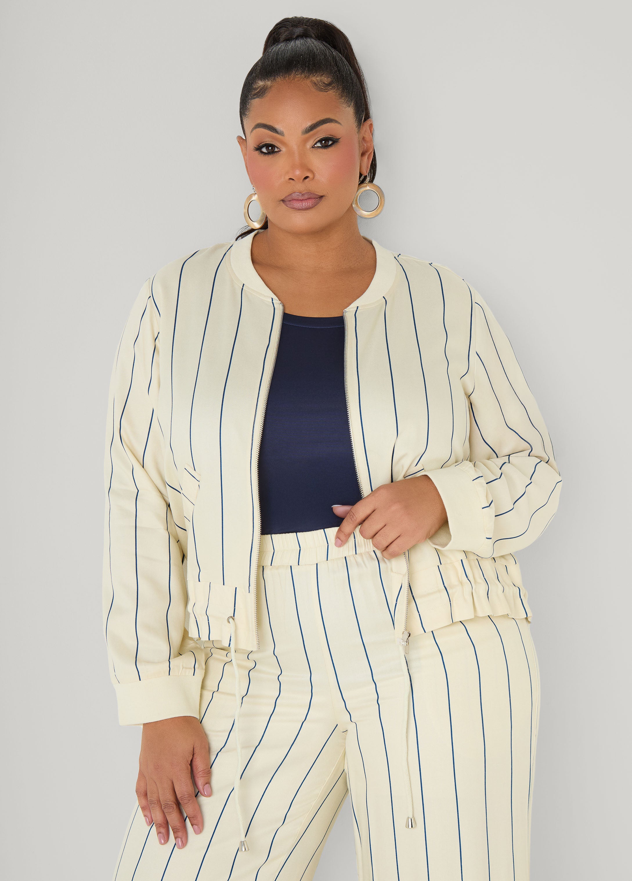 Throw on this pinstriped jacket with cute faux pockets and a cinched drawstring waist for instant aura points. Pair it with the matching pants for a two-piece set that’s equal parts boss and ’fit-ready for anywhere you’re heading.
