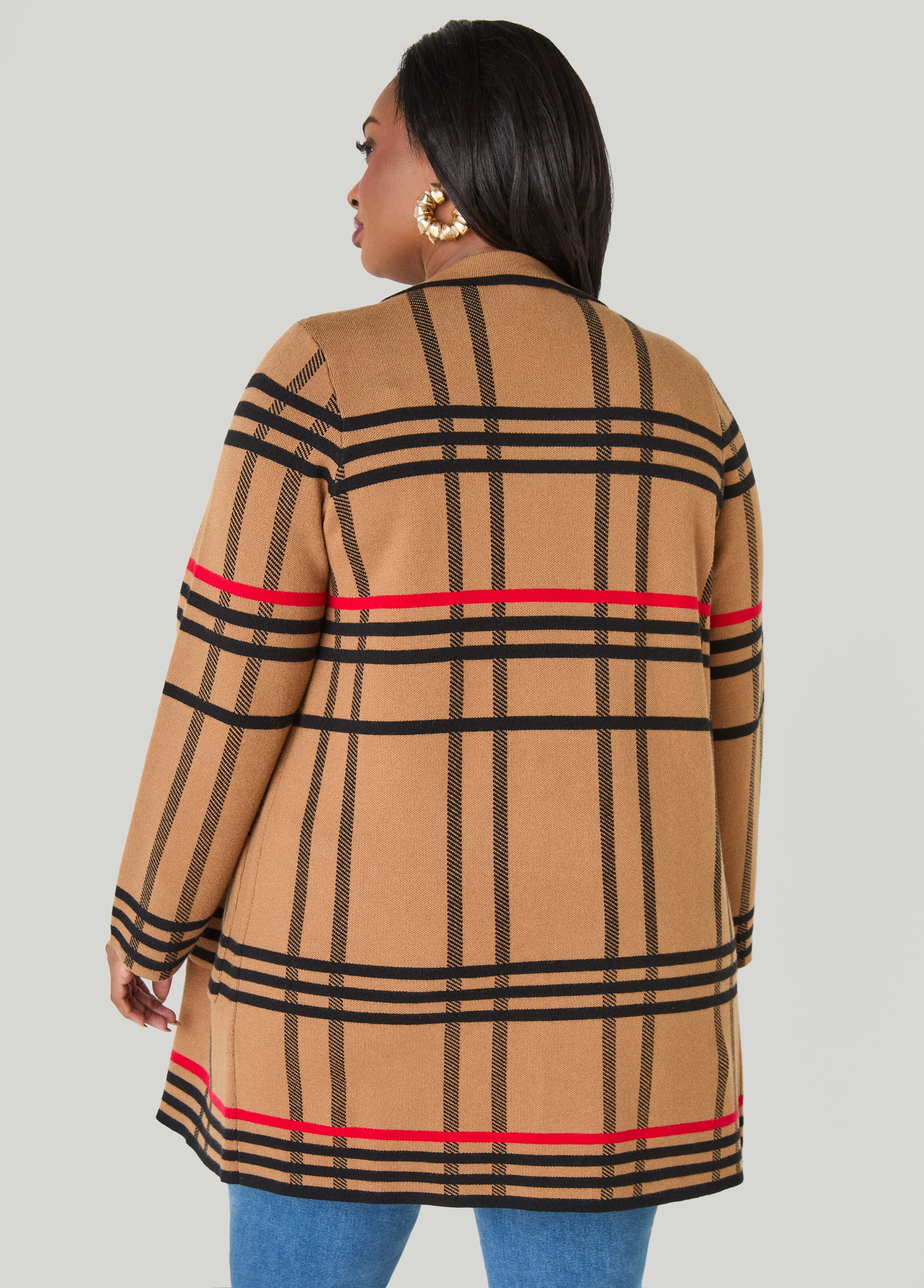 This cozy layer brings classic plaid into a soft, easy intarsia knit with an open front that slips on without fuss. Finished with handy patch pockets, it’s the throw-on piece that keeps your look relaxed and pulled together.