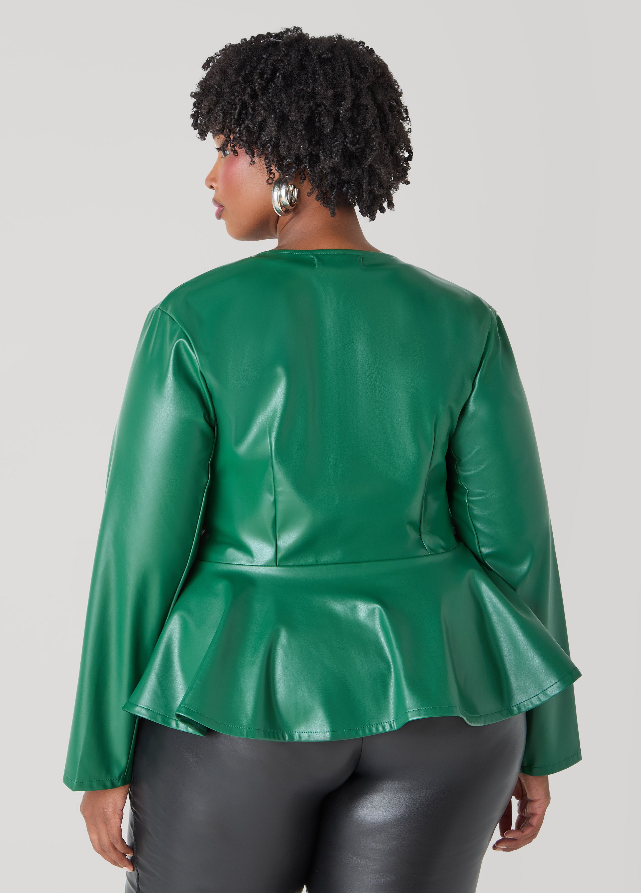 This faux stretch-leather jacket pairs sleek rocker vibes with a flirty peplum for a look that’s all sass and shape.