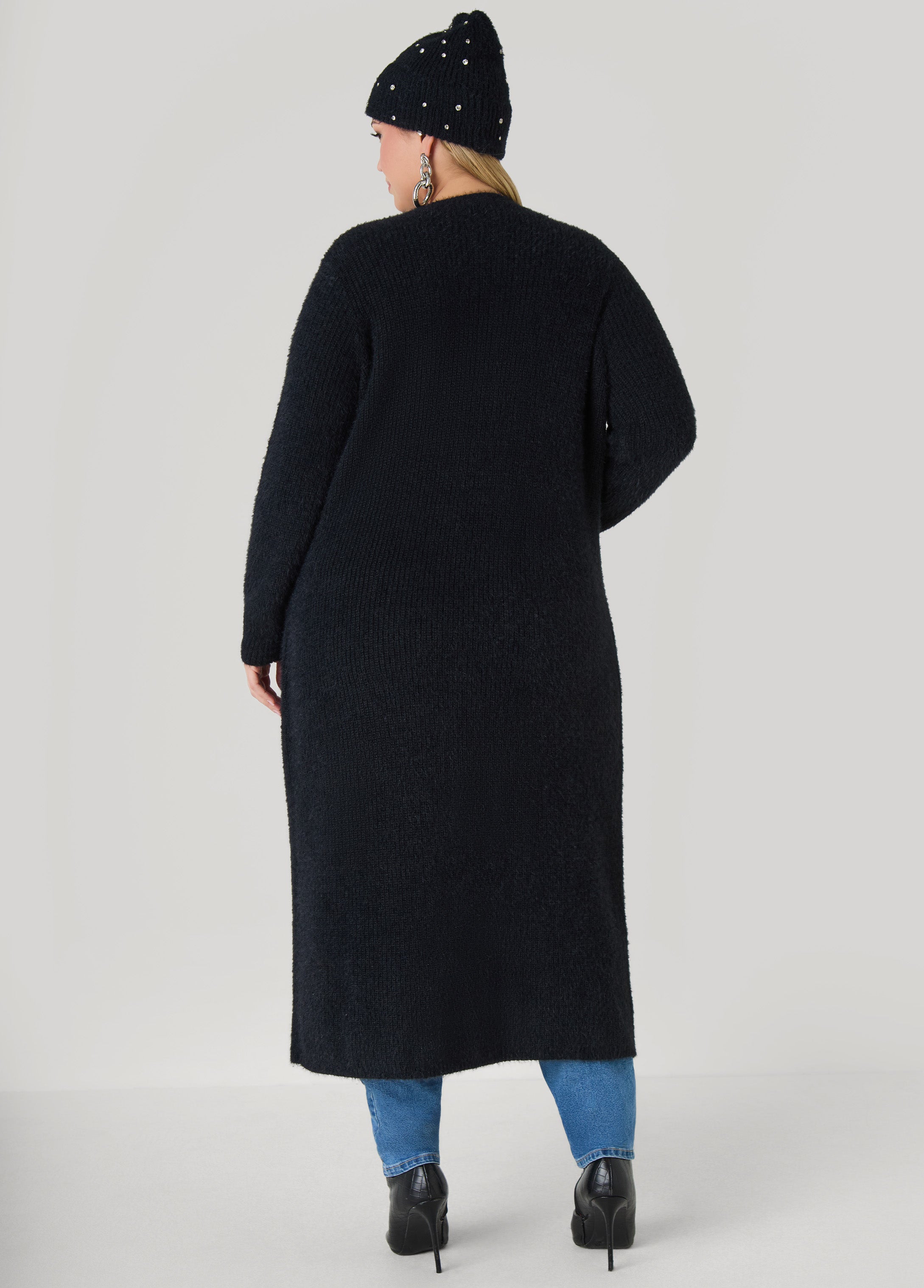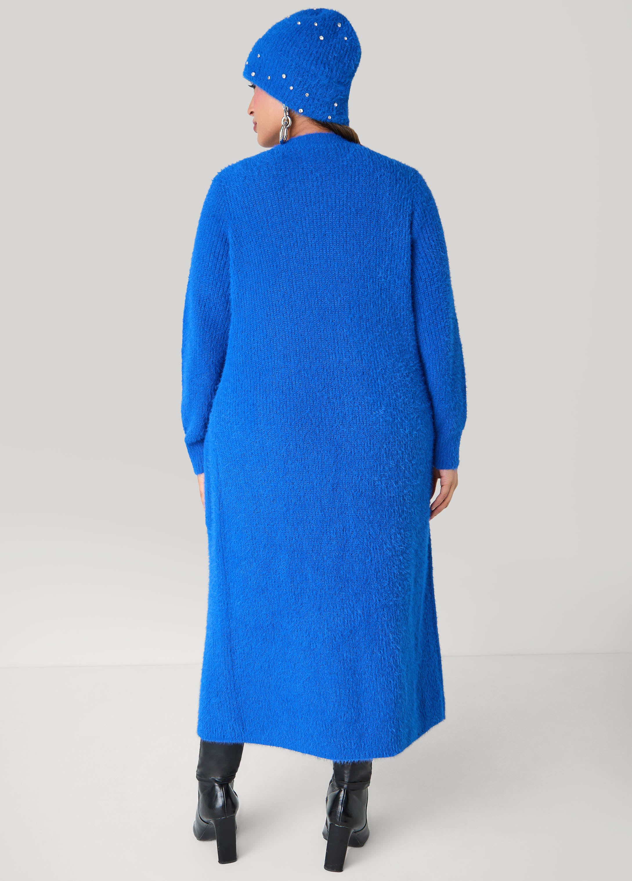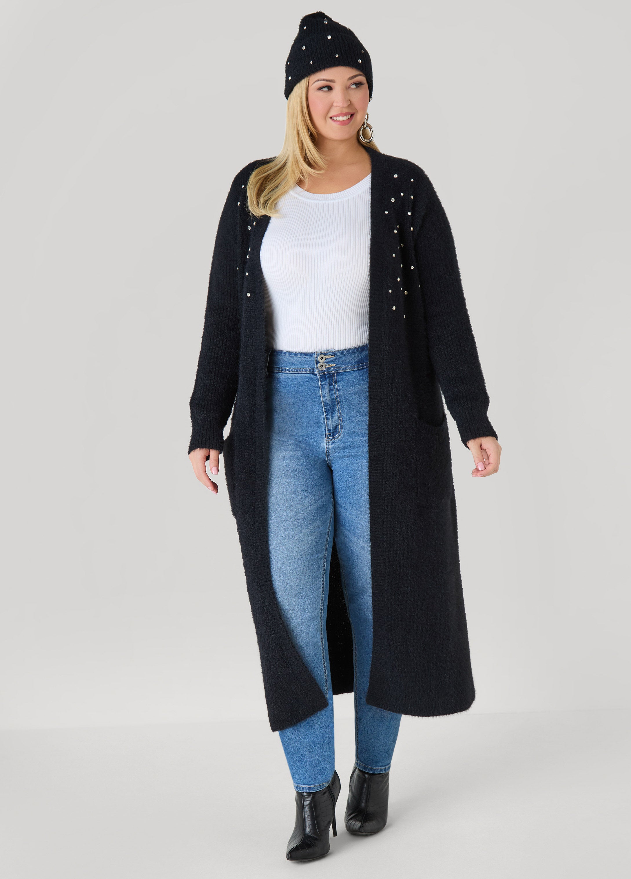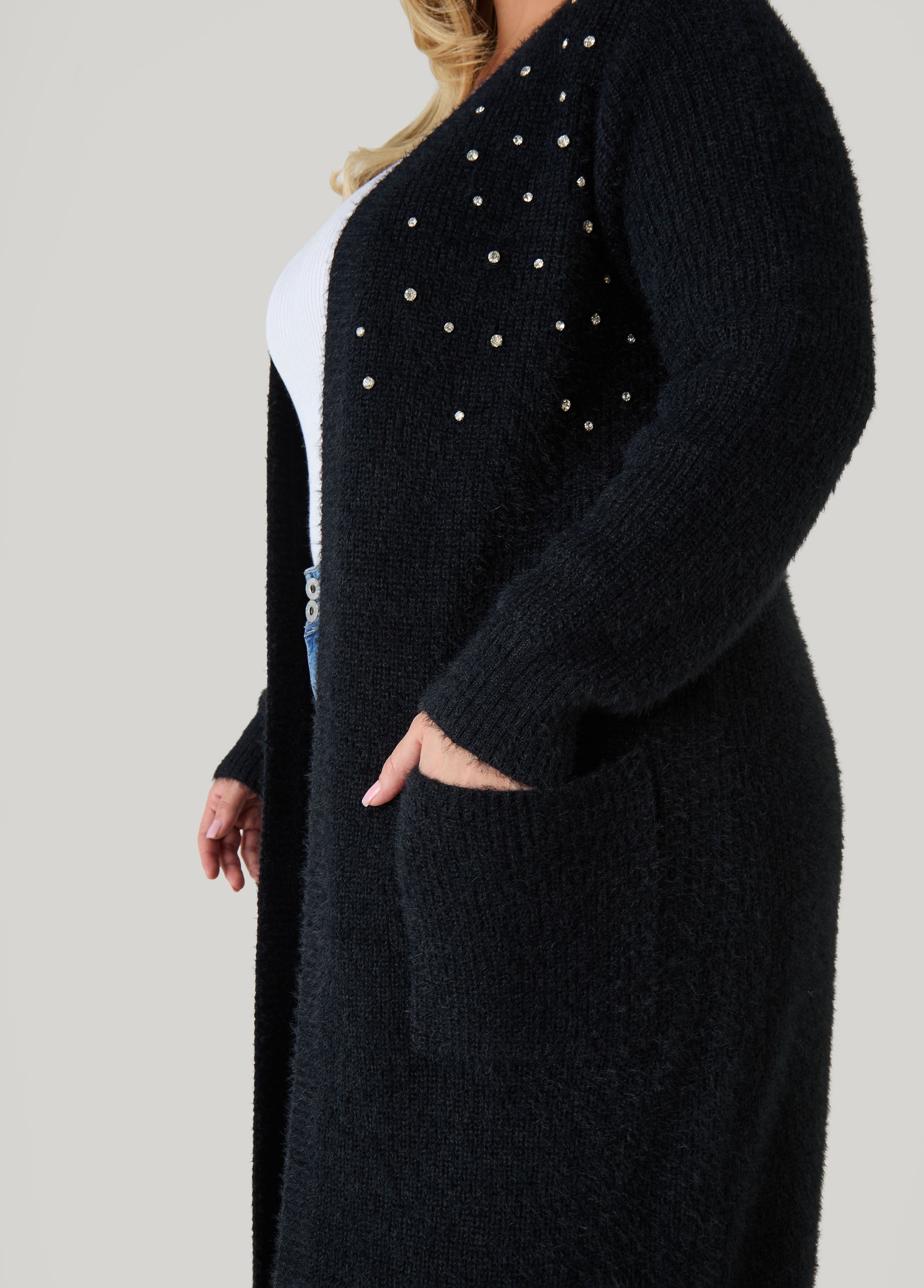 Crystals for days. This brushed-knit duster glimmers with an open front made for layering. Pair it with the matching crystal hat for a fun, winter look.