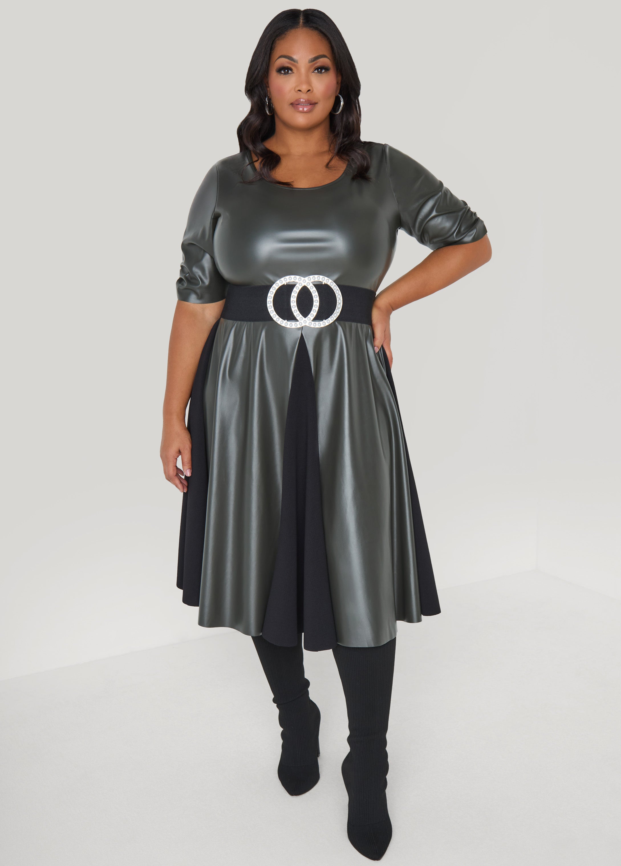 This faux leather dress is an instant hit with ruched sleeves and playful textured-knit panels along the A-line skirt.
