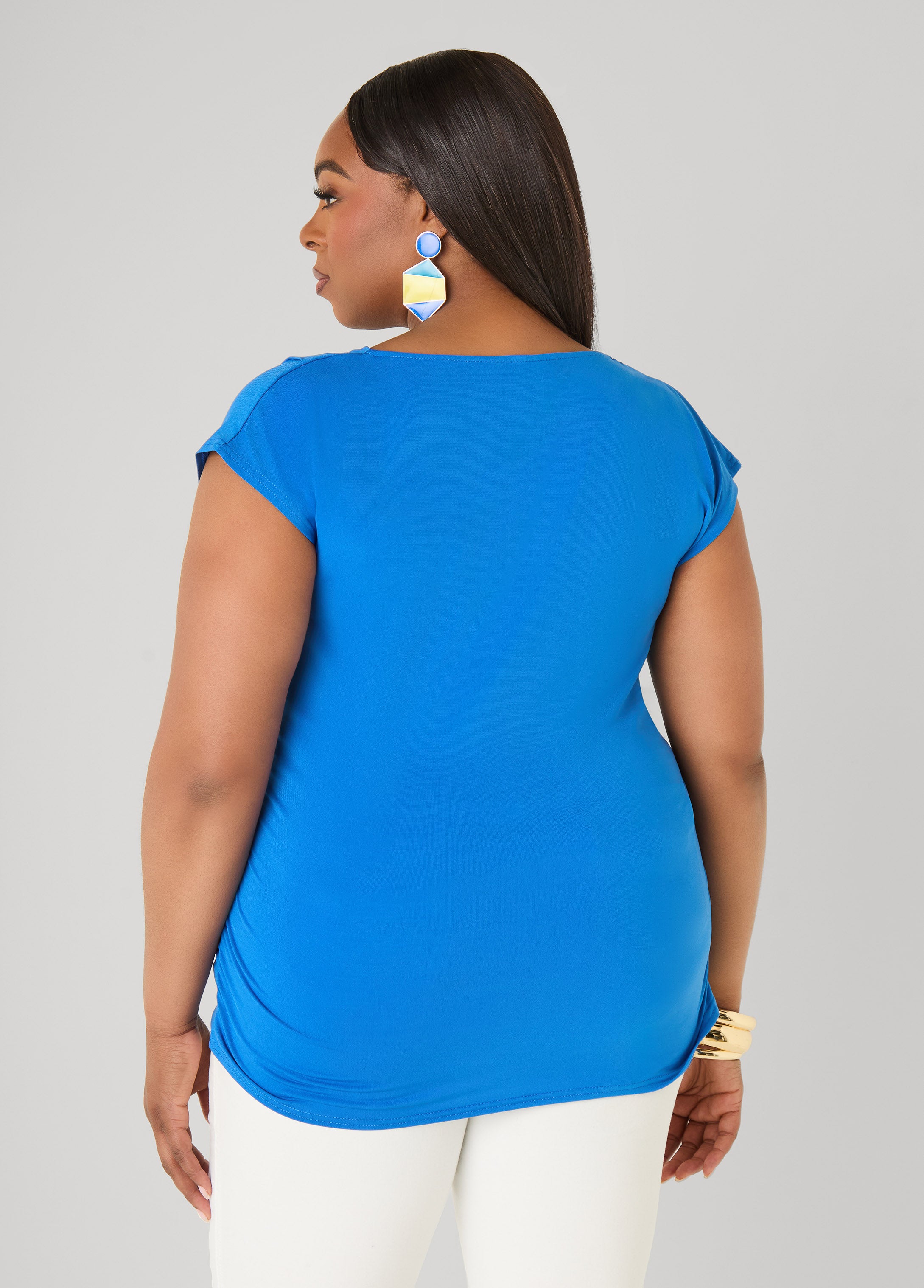 Soft draping with a little intrigue. Designed in a smooth knit, this top leans into a relaxed cowl neck and side ruching that shapes and sculpts.