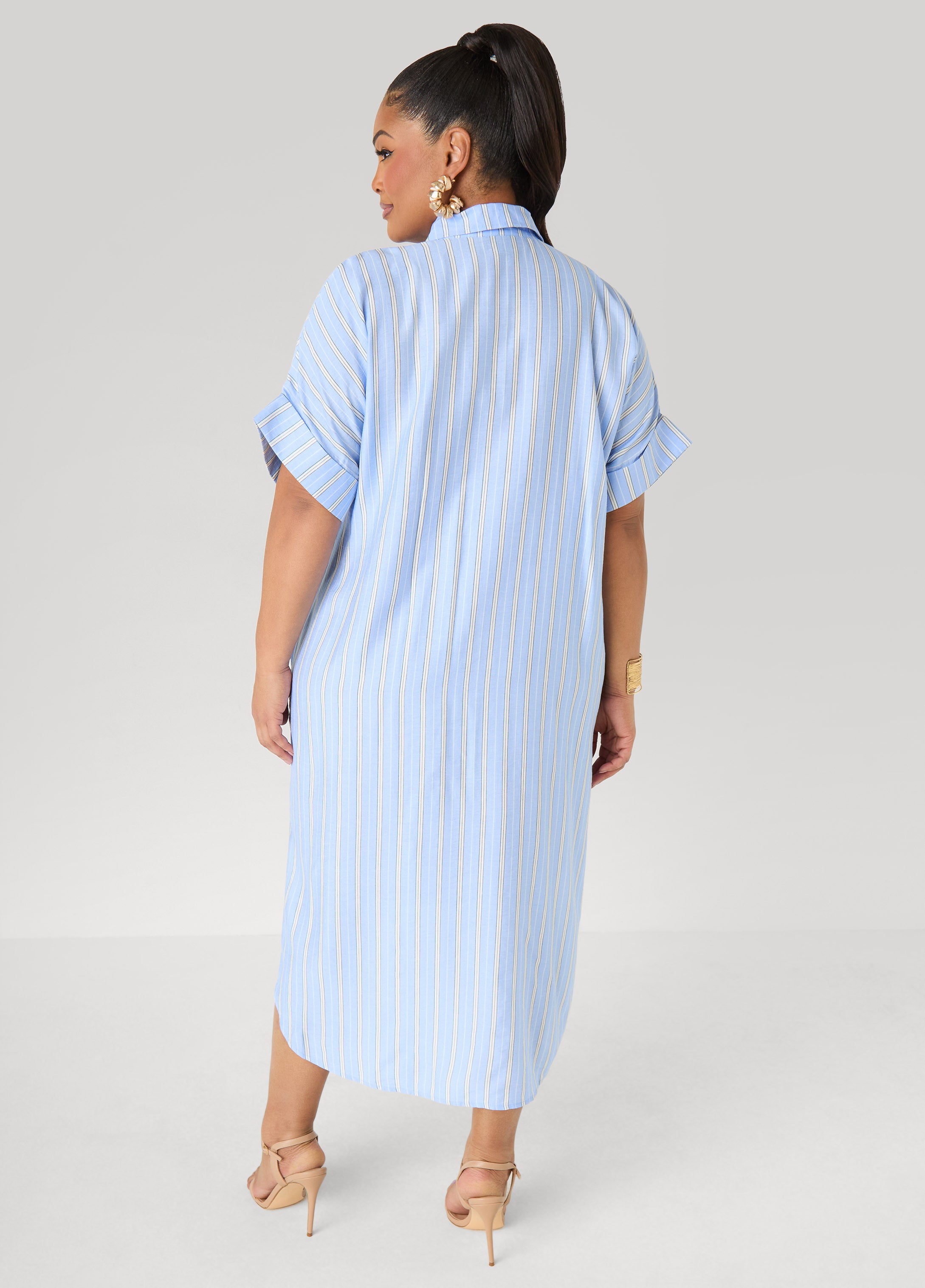 Classic stripes up front, party in the details, this midi shirtdress features cuffed sleeves, a dipped back hem and crystal buttons in the most unexpected shapes for sprinkles of personality along the lines.